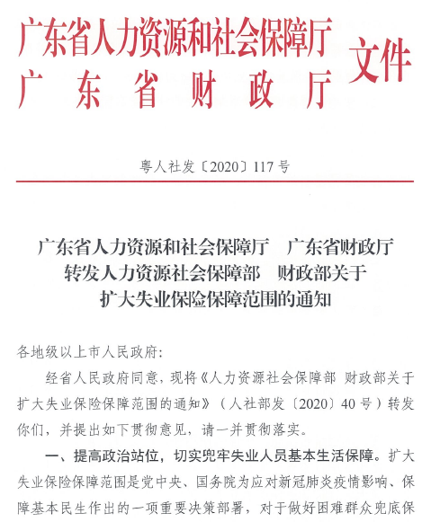 附件:廣東省人力資源和社會保障廳 廣東省財政廳轉(zhuǎn)發(fā)人力資源社會保障部 財政部關(guān)于擴大失業(yè)保險保障范圍的通知(粵人社發(fā)〔2020〕117號)