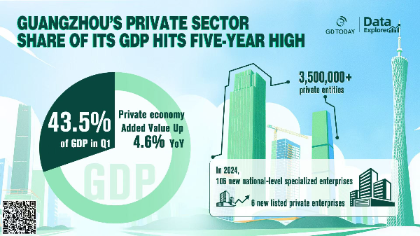 Guangzhou's private economy continues to drive the city's growth, with the sector accounting for 43.5% of the city's GDP in the first quarter of 2025, its highest share in five years. According to data released by the Guangzhou Municipal Industry and Information Technology Bureau, the value added by the private sector rose 4.6% year-on-year during the period under review.