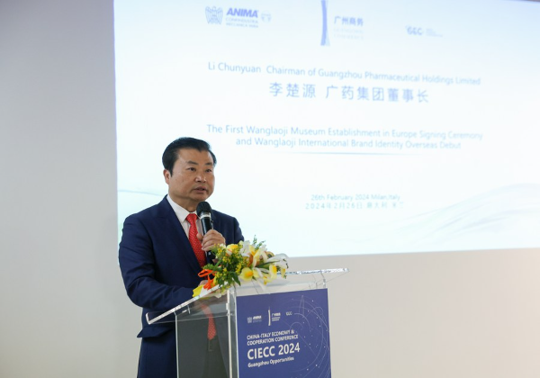 Li Chuyuan, chairman of Guangzhou Pharmaceutical Holdings Ltd., speaks at the debut press conference of WALOVI, a Chinese herbal tea brand, in Milan, Italy, on Feb. 26, 2024.