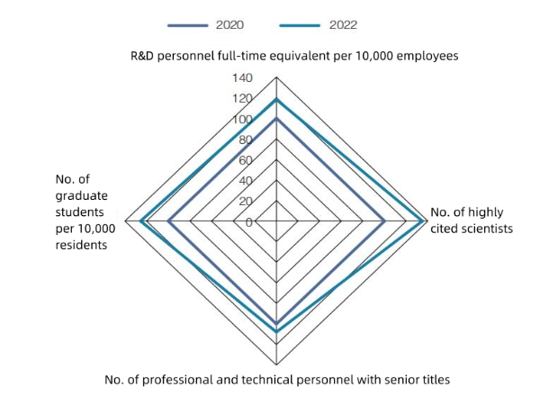 As for talent, Guangzhou has attracted a large number of high-level talents, the index number of highly cited scientists is especially outstanding, and the full-time equivalent index of R&D per 10,000 employees increased rapidly.