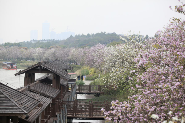 Along a 3.2-kilometer road inside the Haizhu Wetland, a national-level wetland park in the city's Haizhu district, bauhinia trees are blooming right on schedule, forming a white and pink flower sea.