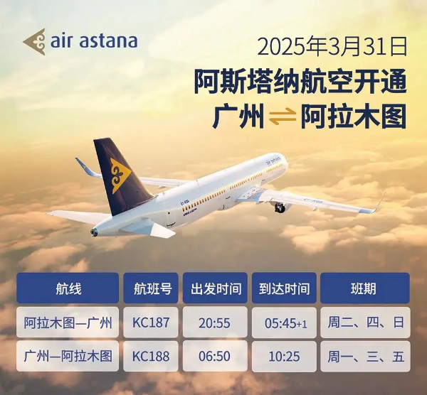 Air Astana has launched a direct flight from Almaty to Guangzhou, with flight number KC187/8. The outbound flight departs Almaty every Tuesday, Thursday, and Sunday, arriving in Guangzhou early the next morning. The return flight departs Guangzhou every Wednesday, Friday, and Monday.