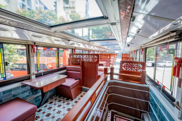 The interior design of the bus showcases the charms of Cantonese culture, and the second floor, with its transparent windows and roof, offers the best spot for taking a selfie and enjoying the beautiful night view.