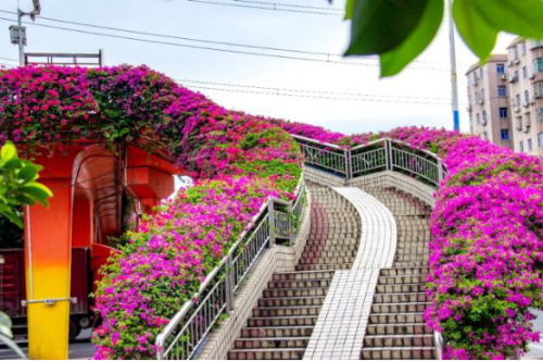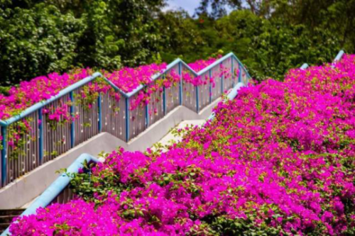 The pedestrian overpass at Baosha Road on Kaifa Avenue offers the best opportunity to capture stunning photographs of paperflowers that will "go viral". With a total greening length of 280 meters, the bridge is planted with red and purple paperflower varieties.