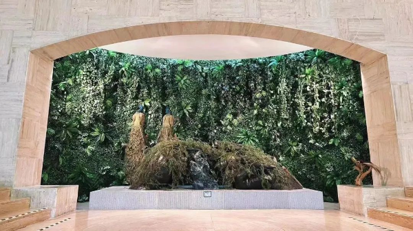 Furthermore, the design of the exhibition hall incorporates Lingnan garden elements such as octagonal gates, ceramic sunflower-shaped windows, and red brick fences, with green vines, two large peacock specimens, as well as specimens of other birds and insects as decoration. Visiting the exhibition is like a stroll in the botanical garden.