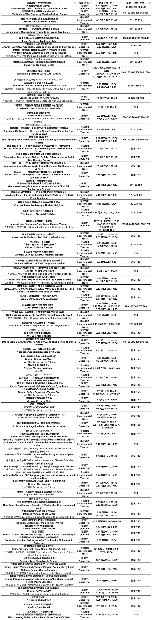 Some of the must-see theatrical works by domestic art troupes include dance drama "Wing Chun", original ballet "The Legend of the White Snake" by Guangzhou Ballet Theatre, and Yang Liping's Dance Work "The Peacock".
