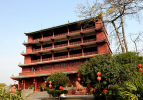 The Zhenhai Tower along the steep mountain slope is shaped like a rhino horn. It serves a triple purpose of "being a town gate, sightseeing and exposition".
