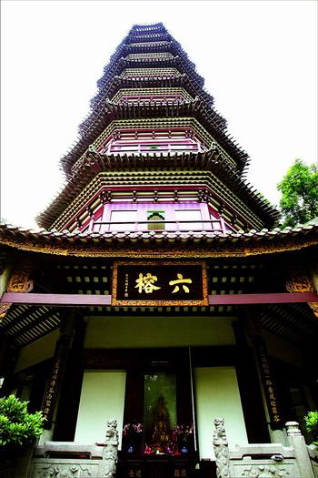 Flower Pagoda is the most featured architecture preserved to date in Liurong Temple (Six Banyan Temple), which was originally named Baoyan Sarira Pagoda and was built together with Baoyan Temple in 537. In the early years of Song Dynasty, it burnt down. In 1806, the first year of Emperor Yuanyou's Reign in Song Dynasty, it was rebuilt and took 11 years to complete. Inside the Flower Pagoda were one thousand Buddha statues, thus it changed its name to Qianfo (one thousand Buddha) Pagoda. It was made of bricks and woods. Today, engravings of Northern Song Dynasty can still be found