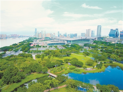 位于琶洲的廣交會(huì)會(huì)展場館,與珠江、公園和寫字樓形成了一幅美麗的城市圖景。