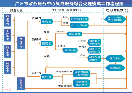 今年2月29日,廣州市一級集成服務(wù)綜合受理模式正式建成并對外提供服務(wù)。原本分散在各個部門的業(yè)務(wù),全部集中到統(tǒng)一的綜合窗口受理,通過新綜合受理系統(tǒng)統(tǒng)一取號,實現(xiàn)一個窗口受理以上所有業(yè)務(wù)。