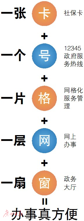 2015年6月,《廣州市“五個一”社會治理政府公共服務(wù)平臺建設(shè)工作方案》正式實施,要求建設(shè)廣州市“一卡(社保卡)、一號(12345政府服務(wù)熱線)、一格(網(wǎng)格化服務(wù)管理)、一網(wǎng)(網(wǎng)上辦事)、一窗(政務(wù)大廳)”社會治理政府公共服務(wù)平臺。通過整合不同部門、不同層級、不同業(yè)務(wù)、不同系統(tǒng)的資源,實現(xiàn)區(qū)、街(鎮(zhèn))、社區(qū)統(tǒng)一使用一個平臺,一套系統(tǒng),對外提供一門式、一站式整體政府服務(wù)。