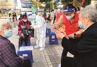 荔灣區站前街黨群服務中心檢測點設有特別通道,由志愿者為老年人提供協助。