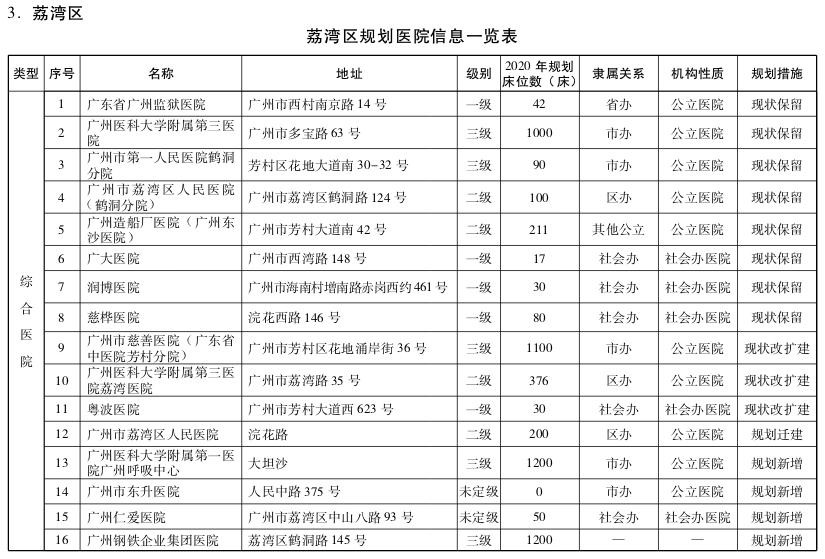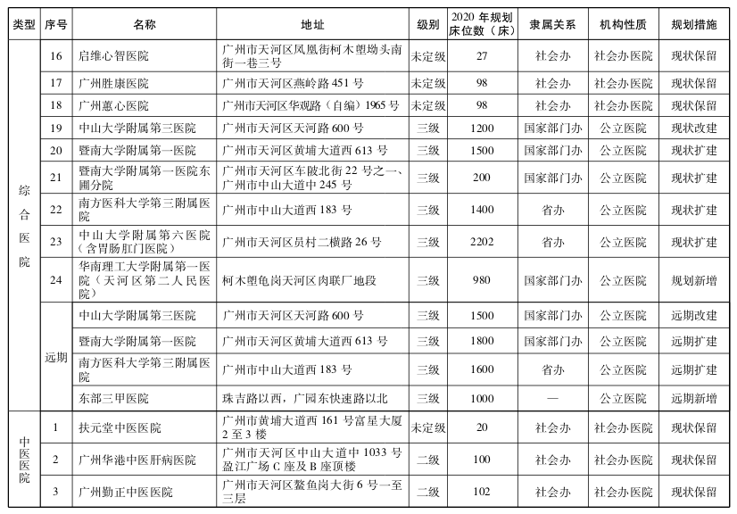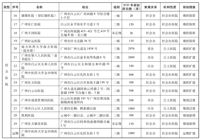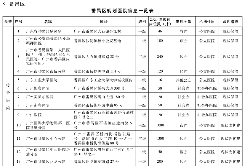 2020年,廣州市共規劃綜合醫院169間,其中現狀保留87間,規劃新增22間,改擴建(含遷建)60間。