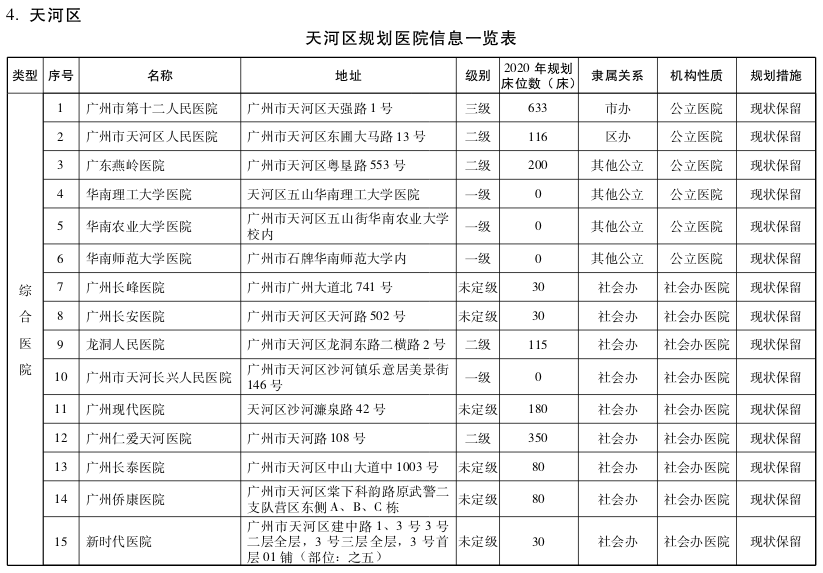 天河區為優化提升區,以整合現有醫療衛生資源、引進高水平社會辦醫療機構為策略。重點增加天河東部、北部醫療資源配置,規劃設置相應規模的公立醫療衛生機構,除現有建設項目外,嚴控天河區西南部公立醫院規模、床位不合理擴張;鼓勵優質社會資本提供婦女兒童、老年護理、口腔、中醫等專科服務;鼓勵區域內優質公立醫療資源向資源薄弱地區轉移,支持區內資源富余的二級以下公立綜合醫院,逐步轉型為護理院、康復醫院或者社區衛生服務機構,至少設置1家護理院、康復醫院或醫養結合機構。