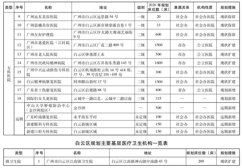 白云區為擴容提質區。白云南部未來應實現“量足”到“質優”的轉變,重點調整醫療資源布局和結構,重點增加康復、老年護理、婦女兒童、精神衛生等緊缺??频拇参慌渲?;白云北部著重擴容,在鐘落潭鎮、龍歸城等區域規劃設置相應規模的公立醫療衛生機構,適當增加床位配置;支持區內資源富余的二級以下公立綜合醫院,逐步轉型為護理院、康復醫院或者社區衛生服務機構,至少設置1家護理院、康復醫院或醫養結合機構;重點引進高水平社會辦醫療機構,建設廣州國際健康產業城、廣州國際??漆t療中心。