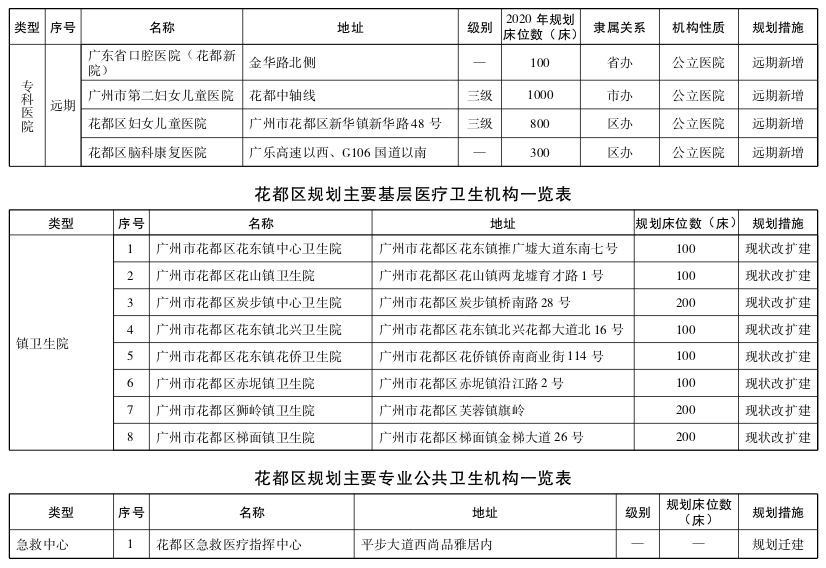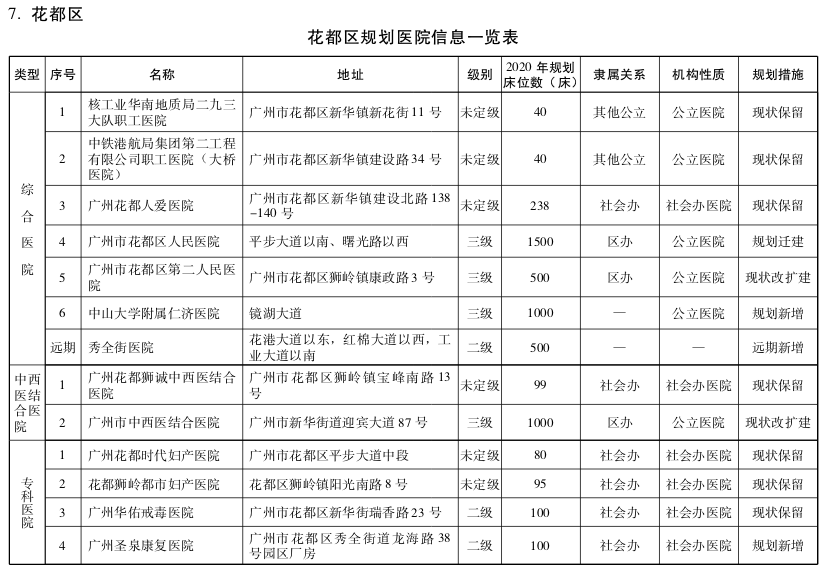 花都區為擴容提質區。加大對區域醫療資源的配置力度,重點增加婦女兒童、腦科、康復、口腔等公立醫療資源配置;增加鎮衛生院床位配置;鼓勵優質社會資本提供婦產、老年護理、康復、自愿戒毒等??品眨恢辽僭O置1家護理院、康復醫院或醫養結合機構。
