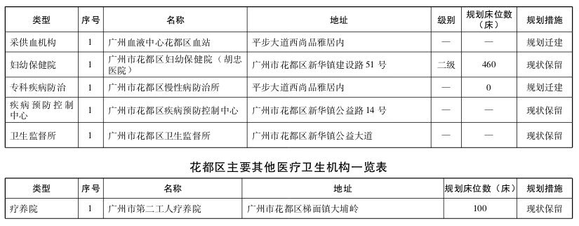 至2020年,花都區規劃常住人口180萬人。規劃綜合醫院6個,中西醫結合醫院2個,??漆t院4個。規劃急救中心1個,采供血機構1個,婦幼保健院1個,??萍膊》乐卧?個,疾病預防控制中心1個,衛生監督所1個,療養院1個。按照基層醫療衛生機構規劃原則,結合常住人口數量,規劃(2035年)鎮衛生院8個,社區衛生服務中心(站)23個。