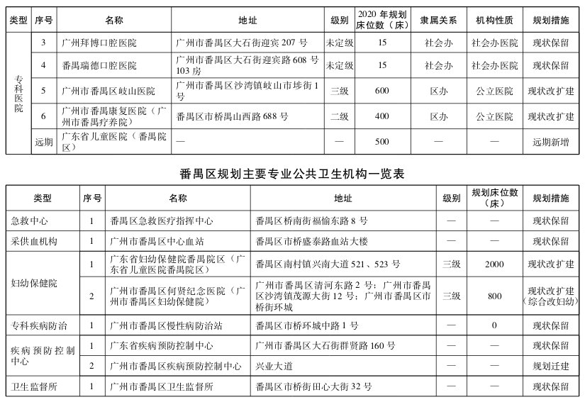 至2020年,番禺區規劃常住人口180萬人。規劃綜合醫院22個,中醫醫院3個,專科醫院6個。規劃急救中心1個,采供血機構1個,婦幼保健院2個,??萍膊》乐卧?個,疾病預防控制中心2個,衛生監督所1個。按照基層醫療衛生機構規劃原則,結合常住人口數量,規劃(2035年)社區衛生服務中心(站)156個。