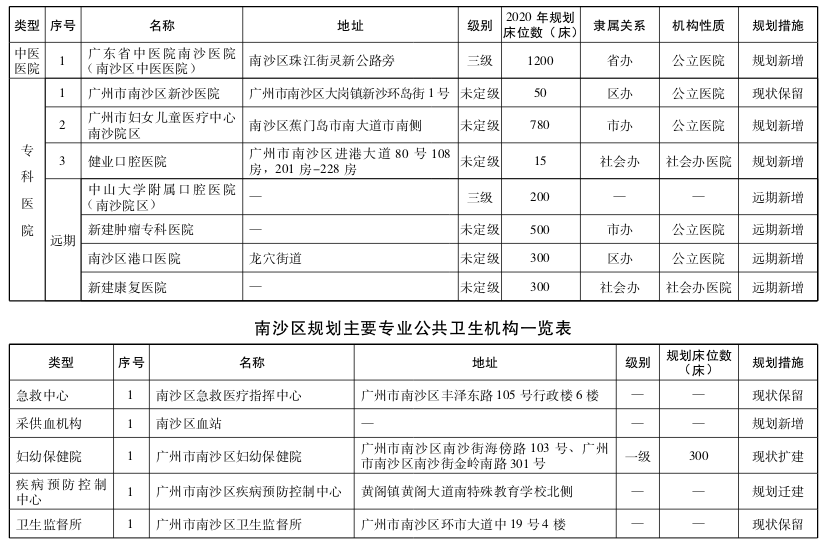 南沙區為擴容提質區。加大對區域醫療資源的配置力度,增加綜合、婦女兒童、口腔、腫瘤、中醫等醫療資源;至少設置1家護理院、康復醫院或醫養結合機構;鼓勵社會資本引進國際化高端醫療資源,以國際化視野和服務標準建造集臨床醫療、健康管理、特色專科聚集的,立足港澳、輻射東南亞的高端醫療產業鏈,建設南沙新區國家健康醫療旅游示范基地。允許南沙區在現有規劃基礎上,規劃新增1家以上綜合或??漆t院。