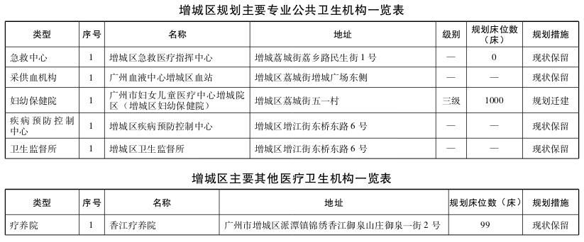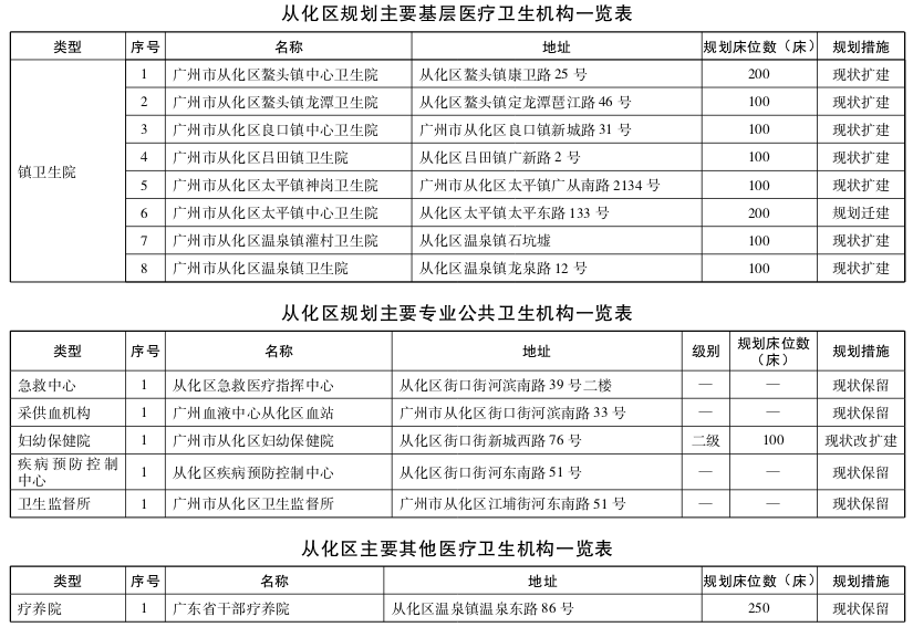從化區為擴容提質區。加大對區域醫療資源的配置力度,增加綜合、婦女兒童、中醫、康復等公立醫療資源配置,在太平鎮等區域規劃設置相應規模的醫療衛生機構;鼓勵社會資本引進婦產、老年護理、精神衛生等醫療機構;增加鎮衛生院床位配置;至少設置1家護理院、康復醫院或醫養結合機構。允許從化區在現有規劃基礎上,規劃新增1家以上綜合或??漆t院。