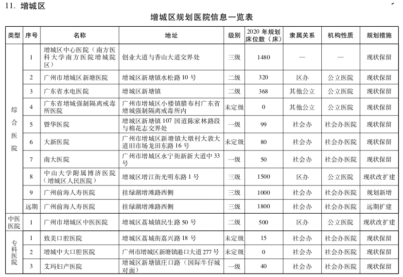 增城區為擴容提質區。加大對區域醫療資源的配置力度,重點增加綜合、婦女兒童等公立醫療資源配置;鼓勵社會資本引進引進婦產、老年護理、康復、口腔等醫療機構;至少設置1家護理院、康復醫院或醫養結合機構;建設增城高灘健康小鎮。允許增城區在現有規劃基礎上,規劃新增1家以上綜合或??漆t院。