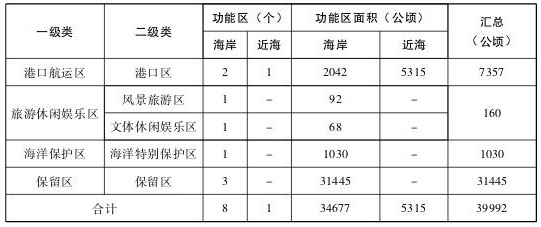 海洋基本功能區(qū)分海岸基本功能區(qū)和近海基本功能區(qū)兩類。海岸基本功能區(qū)是指依托海岸線,向海有一定寬度的海洋基本功能區(qū)。近海基本功能區(qū)是指海岸基本功能區(qū)向海一側(cè)的外界與省(區(qū)、市)管理海域外部界線之間的海洋基本功能區(qū)。