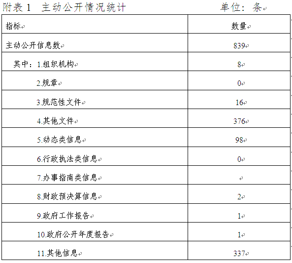 本單位2015年全年主動公開政府信息839條,其中組織機構信息8條、規范性文件16件、其他文件376件、動態類信息98條、財政決算信息2條、政府工作報告1件、政府信息公開年度報告1份及其他信息337條。在主動公開的信息中,屬于本單位業務類信息490條,占總體的比例為58.4%。