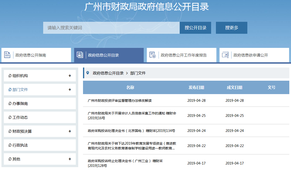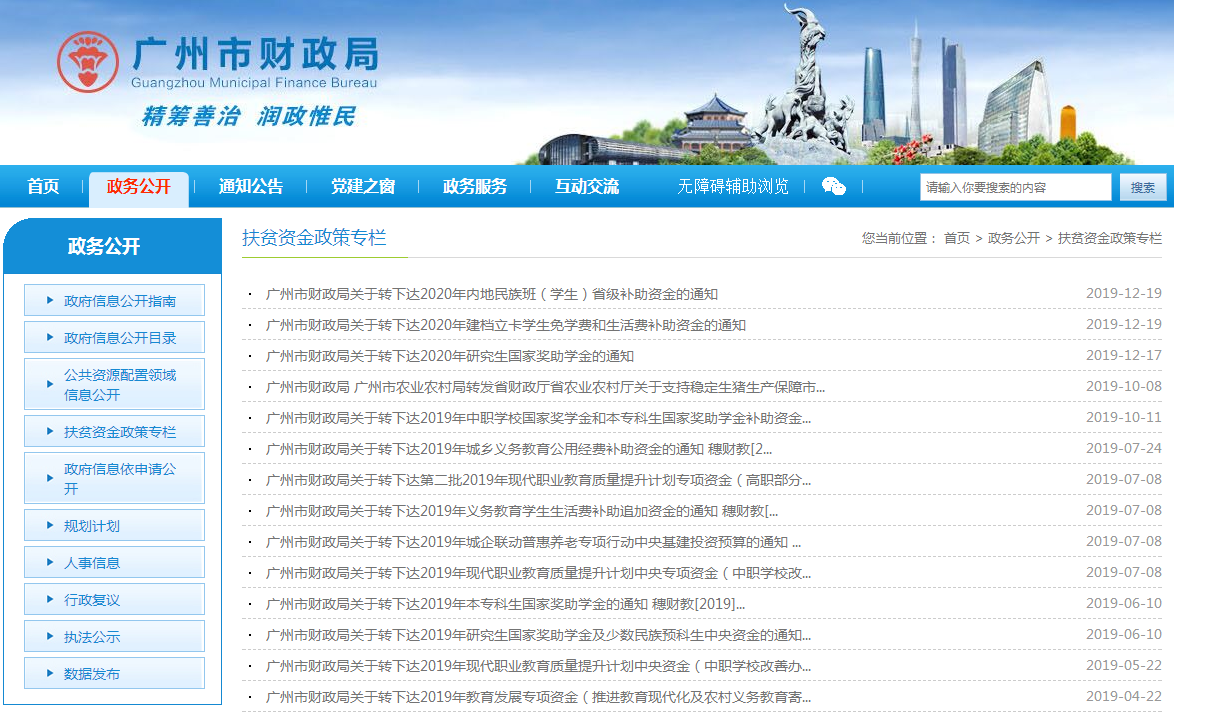 廣州市財政局網站開設扶貧資金政策專欄,2019年公開扶貧資金政策文件31份。