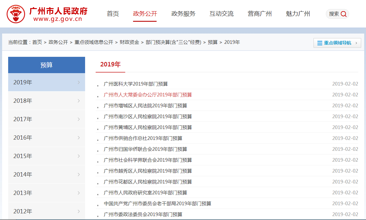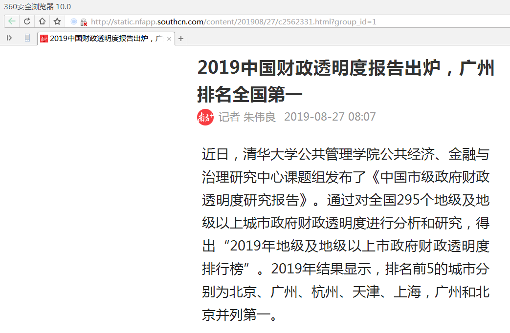在清華大學公共管理學院公共經濟、金融與治理研究中心課題組發布的“2019年地級及地級以上市政府財政透明度排行榜”上,廣州與北京在全國295個地級及地級以上城市中并列第一。課題組指出“在過去兩年里,北京、廣州、杭州在財政信息公開工作方面都處于領先的位置,為其他城市起到良好的示范作用。”