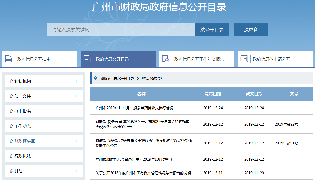 2019年,我局積極打造廣州“陽光財政”平臺,在我局網站和市政府門戶網站開設“財政預決算”重點領域公開專欄,及時公開政府預決算、部門預決算、“三公”經費和會議費、政府與社會資本合作(PPP)項目、減稅降費、財政收支等信息,不斷提高財政透明度。