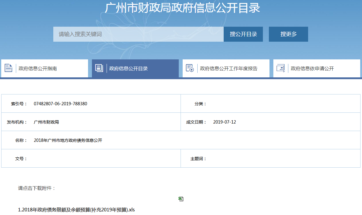 細化財政信息公開,在廣州市政府門戶網站“政務公開-財政資金-財政預決算”欄目和廣州市財政局網站“政務公開-信息公開目錄-財政預決算”欄目公開《2018年廣州市地方政府債務信息公開》,內容包括政府債務余額、限額、債券發行和債券存續期等政府債務相關信息。