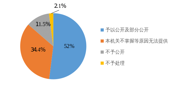 全年共辦理政府信息公開申請1256宗,同比減少9.7%,其中辦理自然人申請1128宗,法人或其他組織申請件128宗,均在法定期限內予以答復。予以公開及部分公開653宗,占52%;不予公開145宗,占11.5%;因本機關不掌握等原因無法提供432宗,占34.4%;不予處理26宗,占2.1%。信息公開類行政復議62起,訴訟42起,其中被糾錯15起,勝訴率85.6%。依法依規(guī)做好政府信息依申請公開工作,針對行政復議訴訟被糾錯頻發(fā)的情況,建立行政復議訴訟被糾錯問題的查擺機制,會同被糾錯重點單位梳痛點、堵漏洞;梳理典型案例并在區(qū)政務公開培訓會上詳細講解,提高全區(qū)政府信息依申請公開辦理水平。