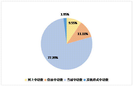 本區2017年共受理信息公開申請513宗。其中當面申請 397宗,占77.39%;網上申請49宗,占9.55%;信函申請57宗,占11.11 %;其他申請10宗,占1.95%。