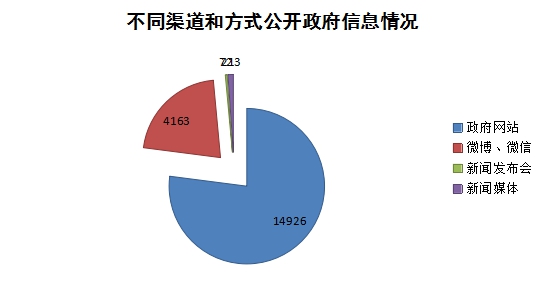 在主動公開信息工作中,通過不同渠道和方式公開政府信息情況:政府網站公開信息14926條,微博微信公開信息4163條,新聞發布會公開信息72條,新聞媒體公開信息213條。