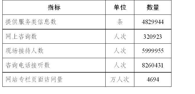 全市共接受市民咨詢1458.1萬人次,其中現(xiàn)場咨詢600.0萬人次,電話咨詢826.0萬人次,網(wǎng)上咨詢32.1萬人次,提供服務(wù)類信息483.0萬條。網(wǎng)站專欄頁面訪問量超過4695萬人次。