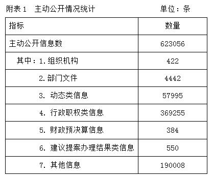 截止2016年12月31日,全年主動公開政府信息約62萬條,其中:1.組織機構(gòu)類信息422條;2.部門文件類(包括規(guī)章、規(guī)范性文件等)信息4442條;3.動態(tài)類信息57995條;4.行政職權(quán)類信息(包括行政審批、執(zhí)法等)約37萬條;5.財政預(yù)決算信息384條;6.建議提案辦理結(jié)果類信息550條;7.其他信息約19萬條。