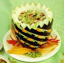 八寶冬瓜盅的特色:此菜汽清色白,冬瓜肉鮮嫩柔軟,味清香,是夏季時令湯菜。