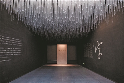 穿過春陽臺的下沉庭院,步入展覽大廳,頭頂是模擬“天雨粟”倉頡造字的傳說圖景,“讀書便佳”幾個書法字蒼勁有力;左邊是《與道大適——中國讀書人的安身與立命》展覽前言,右邊是對展覽提綱挈領的“關鍵字”解讀。