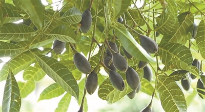 三百洞村黨支部書記李桂深介紹,村里的烏欖約有1000畝,大概有200戶農戶種植該品種。每年農歷八月十五前后是烏欖的成熟期,果實會由青變紫,呈卵狀長圓形,長26-32毫米,直徑15-17毫米,最后會變得油亮發黑。到了這個時候,村民們就會在樹底下鋪上幾張紗網,拿著三四米的長竿爬上樹干打烏欖。