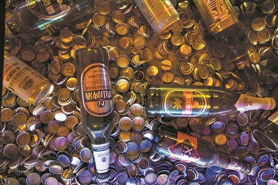 博物館的玻璃地板下用啤酒酒瓶和瓶蓋作為裝飾。