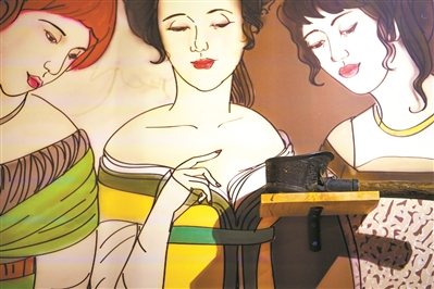 仕女在“看著”一只古代家用熨斗實物,這種熨斗靠里面燒炭加熱。