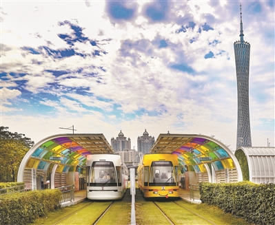 海珠區有軌電車站,頂棚弧線和廣州塔相映成趣。拍客:盧文