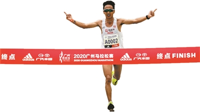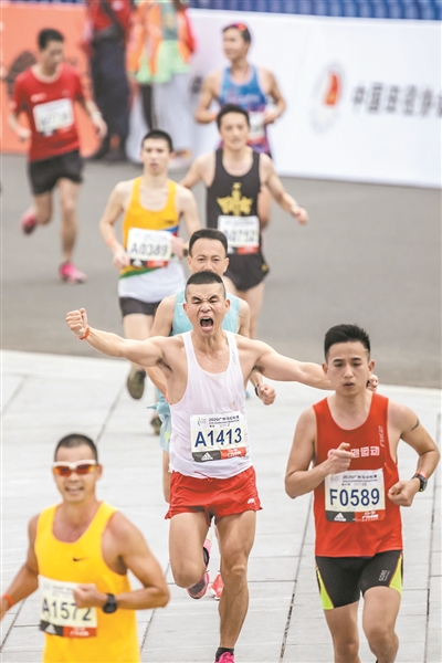 賈俄仁加雙手比“1”沖線,成為廣馬男子組冠軍。