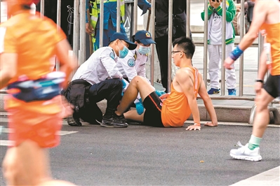 后勤人員救治抽筋的參賽者。