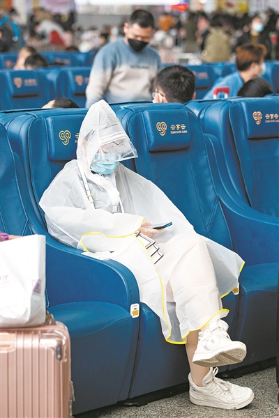 在南站三層候車大廳,人群中一位穿著雨衣戴著手套的旅客引人注目,蔡小姐是武漢人,在廣州做幼兒園老師,因為放寒假,可以早早回武漢過年。她說,“全副武裝”倒不是自己有多害怕,主要是因為家里有老人,她怕在路上、車上沾染細菌病毒,所以多做了一些防護。去年過年她沒能回武漢,今年特意早早買好車票,回家團圓。