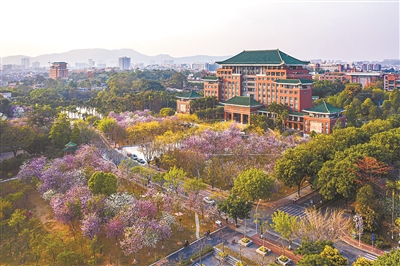華農行政樓前的大片洋紫荊開得燦爛,為校園增添了浪漫氣息。