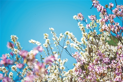 白色紫荊花在藍天的映襯下如雪般潔白。