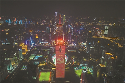 第一華章:世紀(jì)華章。一道道燈光自樓底向上升起,在樓體頂部泛出一圈圈光波,宛如禮花綻放,數(shù)字從1921開始不斷跳轉(zhuǎn),中央樓體數(shù)字最終定格在2021,周圍樓體全亮起,璀璨輝煌,熠熠生輝。