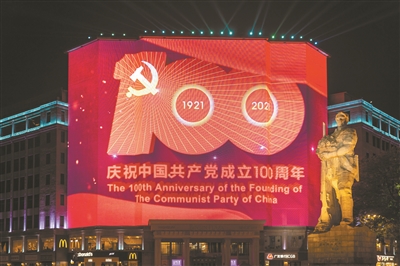 海珠廣場的大屏幕上呈現(xiàn)“慶祝中國共產(chǎn)黨成立100周年”字樣。