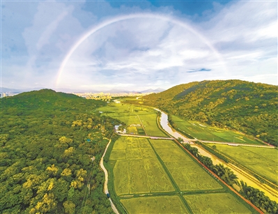 雨后彩虹橫跨于從化艾米稻香小鎮的稻田上,一派田園美景